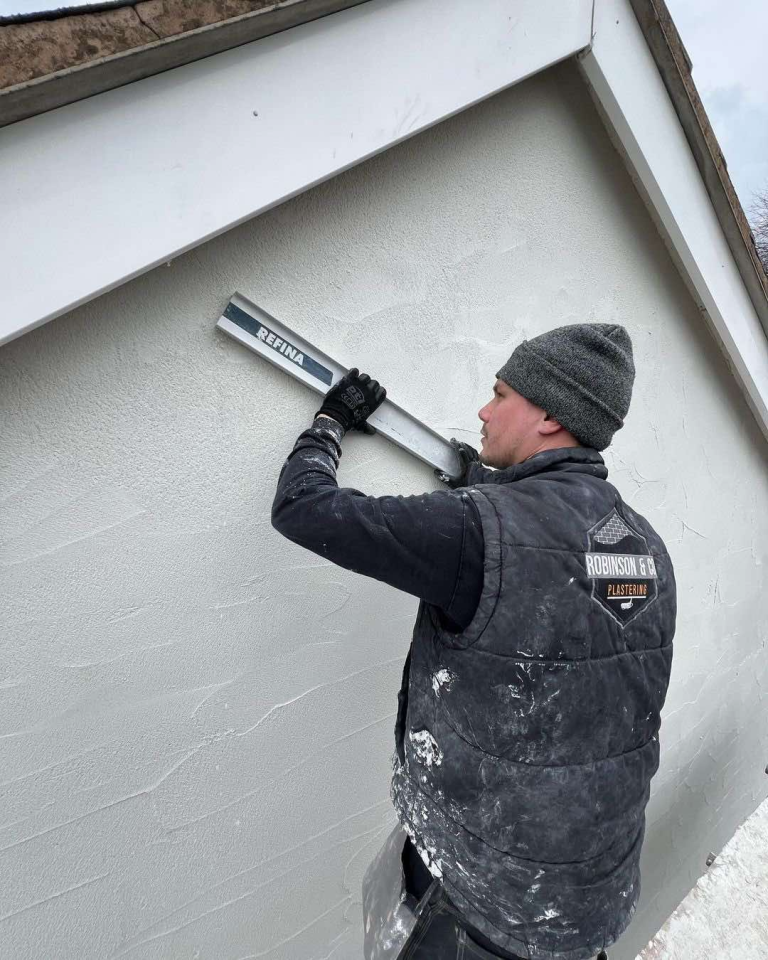 Once the render is level, use a feather edge for final smoothing. Allow the render to set slightly before giving it a final polish with a float.