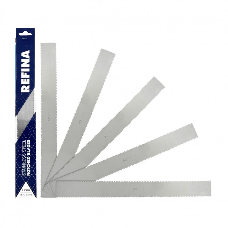 REFINA Replacement V Notch Blades are manufactured from a high quality stainless steel alloy that's designed to be durable and provide a long working life. Complete as a 5pc blade pack, these blades feature an 11" (280mm) length and are ideal for applying, spreading and combing adhesives and other materials for LVT tiles and planks, floor coverings, wood flooring and more.