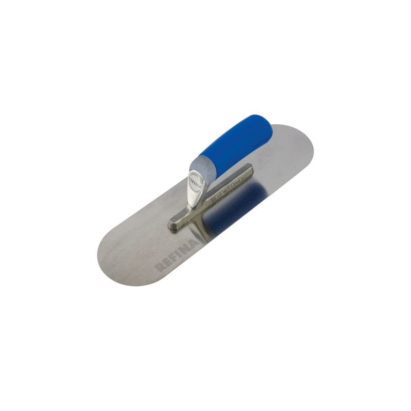REFINA range of premium pool trowels are produced with a high quality stainless steel 0.7mm blade. These specialist trowels feature a full radius nose and heel with a short shank for more flexibility. The narrow shape provides a rigid feel for use on heavier materials such as backing plasters, cements and render. Also available with a long shank offering two flexibility options.