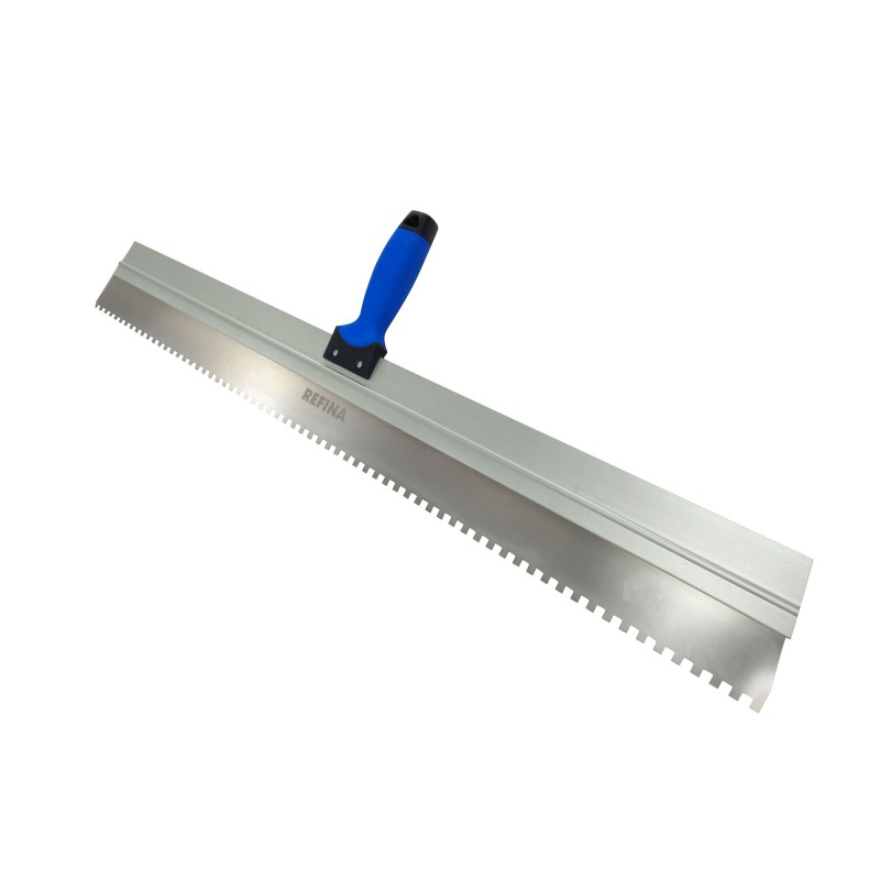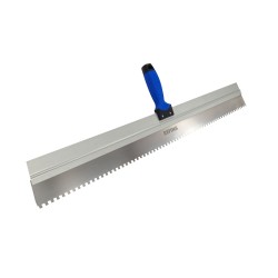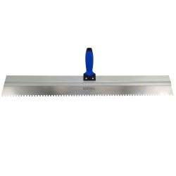 The lightweight aluminium framed serrated spatula has a soft grip handle and features a 6x6mm square notched blade. It is used to evenly distribute material and remove air pockets from top coat monocouche renders.